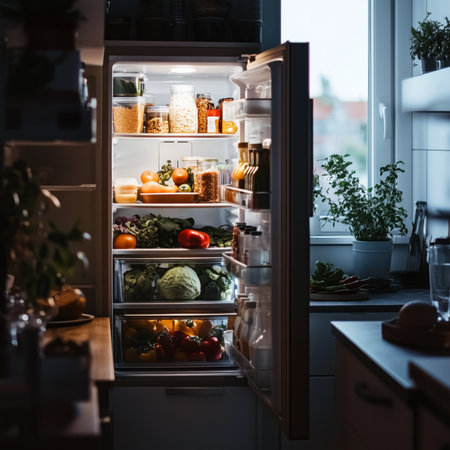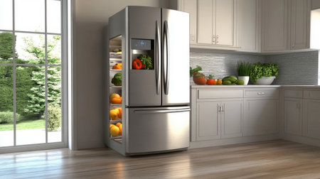 Modern kitchen with smart refrigerator interior displaying organized fresh produce. That the image is generated using AI.