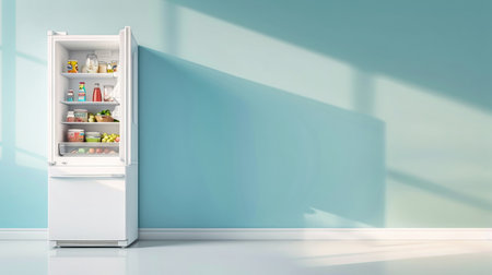 A white refrigerator with its door open, revealing a variety of food items inside. It is standing in a room with cool blue walls and bright, sunlit shadows.