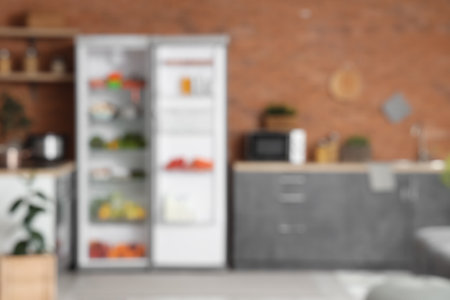 Fridge with fresh products on brown brick background in kitchen. Blurred view