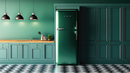 Elegant modern kitchen with retro fridge in pastel pink, standing on shiny checkerboard tile floor with bright lighting
