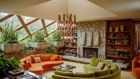 A spacious mid-century modern living room featuring wooden paneling, large windows, and a glass ceiling. The room has orange and green accents with comfortable seating and plants.