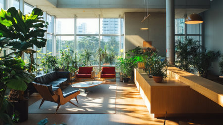 Bright and modern interior showcasing a spacious open area with stylish furniture and lush green plants, creating a cozy and inviting atmosphere for relaxation and collaboration.