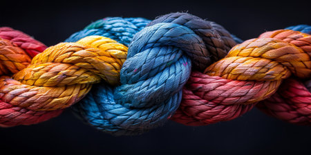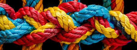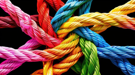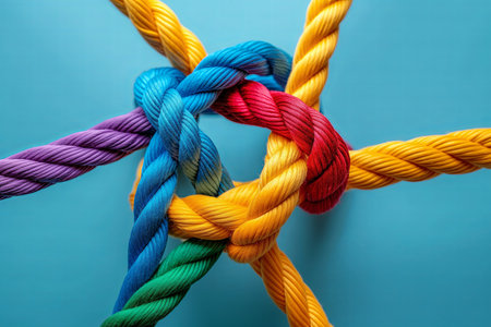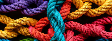 Intertwined ropes of diverse colors symbolize unity and synergy in teamwork, forming a strong, cohesive bond.