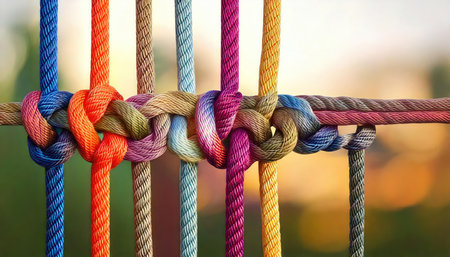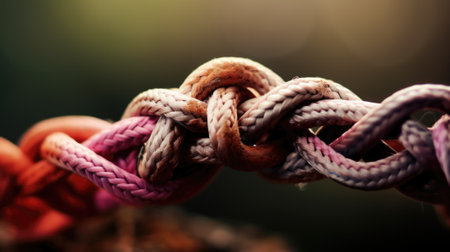 Close-up of interconnected colorful ropes, representing diverse strength and unity in teamwork and communication.