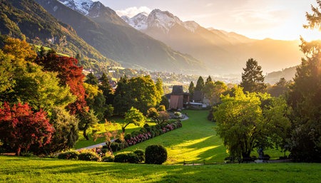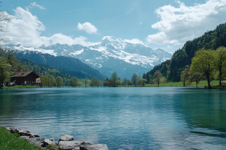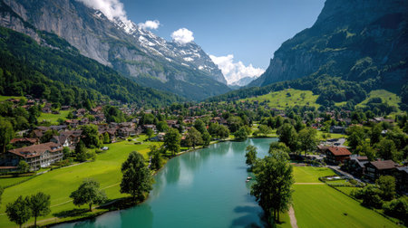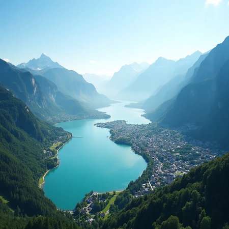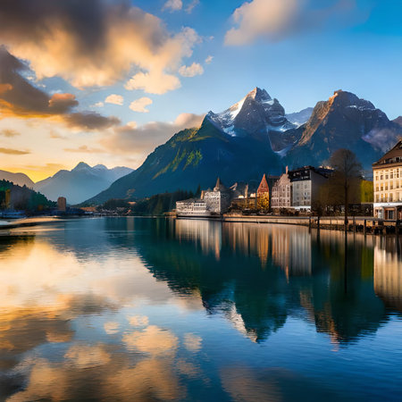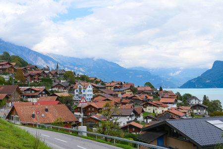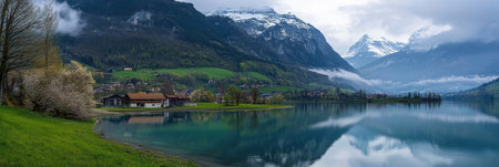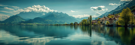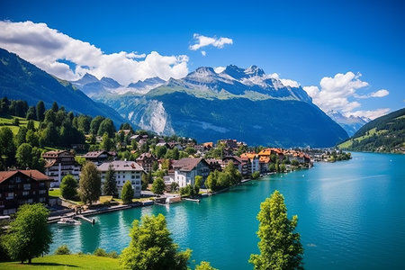 A picturesque Swiss village with stunning mountains and serene lake view