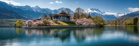 Spring blossoms surround a charming lakeside building, reflecting a peaceful Swiss landscape and towering snow-capped mountains.