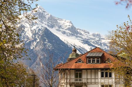 WEESEN, SWITZERLAND - APRIL 16, 2019. Beautiful old house on the background of the Alps on a sunny spring day. Village of Weesen, See-Gaster, canton of St. Gallen, Switzerland