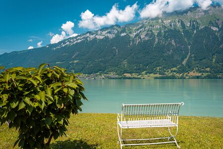 View of Brienz lake with clear turquoise water. On the shore of the lake stands a white wrought iron bench. Place for relaxing, reading books.