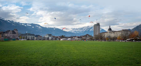 Panoramic view of Hohematte Park with many paragliders - Interlaken, Switzerland