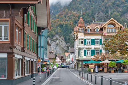 Interlaken, Switzerland - October 2019: Old European buildings located in downtown Interlaken, a famous resort town destination in Switzerland