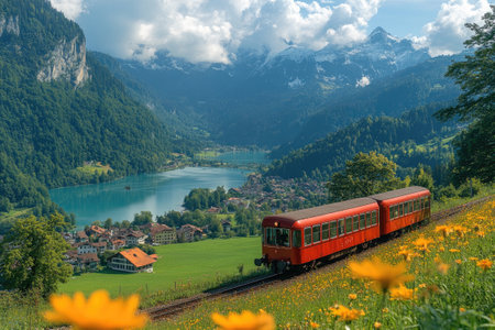 A scenic red train travels through a field of colorful flowers, beside a serene lake, surrounded by majestic mountain peaks and a quaint lakeside village in the Swiss Alps.