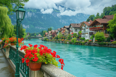 Scenic riverside view with colorful flowers and charming architecture
