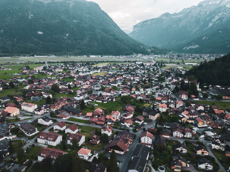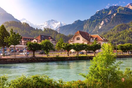 City of Interlaken in Switzerland. Interlaken is a traditional resort town in the mountainous Bernese Oberland region of central Switzerland