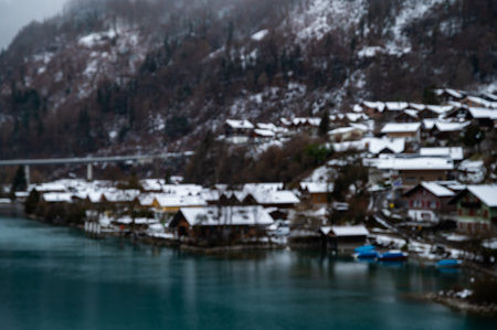 Brienz town on Lake Brienz by Interlaken, Switzerland, with snow covered Alps mountains in background