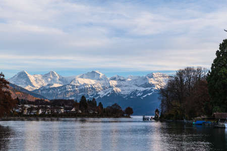 Panorama view of the lake Thun and Bernese Apls including Jungfrau, Monch and Eiger Northface from the lakeside of Thun, Canton of Bern, Switzerland.