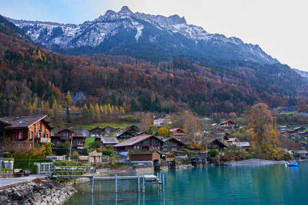 View of Brienz lake with clear turquoise water. Sailing boats. Traditional wooden houses on the shore of Brienz lake in the village of Iseltwald, Switzerland