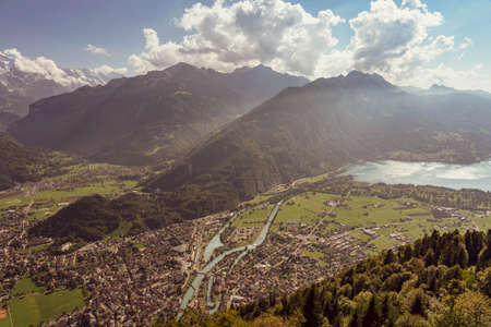 Aerial view over the city of Interlaken in Switzerland. Beautiful view of Interlaken town, Eiger, Monch and Jungfrau mountains and of Lake Thun and Brienz. Interlaken, Bernese Oberland, Switzerland.