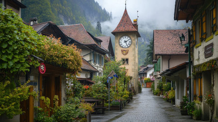 A traditional Swiss clock tower in a charming village.