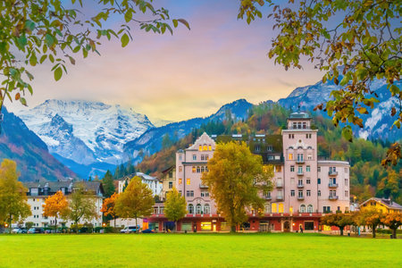 Beautiful landscape of Interlaken downtown with jungfrau peak, Switzerland.