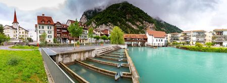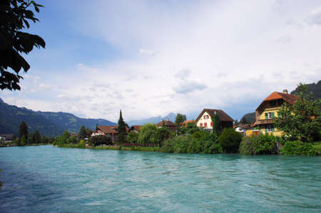 A view of the thorp anear river, with forane mountains and cloudy sky. Interlaken, switzerland