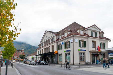 Interlaken, Switzerland - October 2019: Local businesses scene and retail stores located on station road in downtown Interlaken, a famous resort town destination in Switzerland