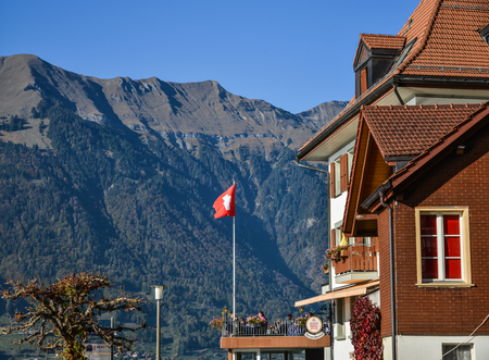 Brienz, Switzerland - Oct 21, 2018. Luxury hotel near the Lake Brienz, Switzerland. The turquoise Lake Brienz is set amid the spectacular mountain scenery.