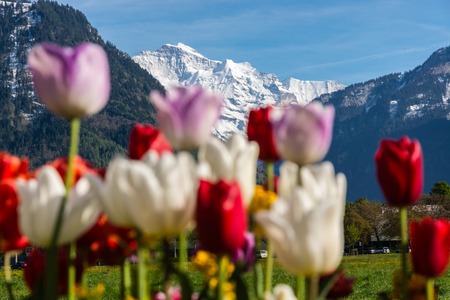 Colorful tulips in Interlaken with beautiful and majestic Jungfrau peak in background