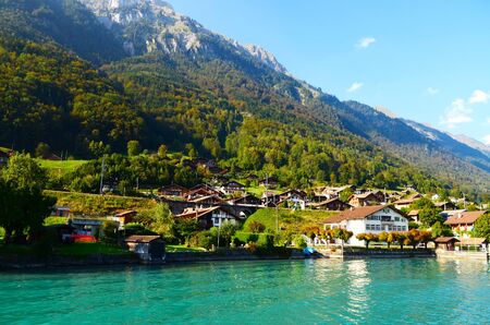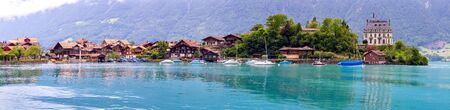 Panorama of the Swiss village of Iseltwald on the famous Lake Brienz. Switzerland.