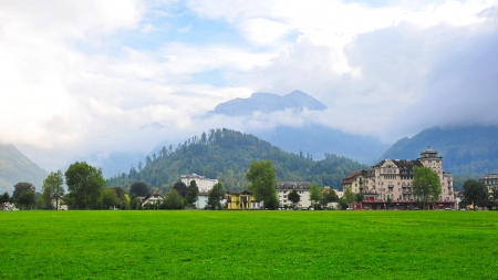 Beautiful scene of town with green field and trees at Interlaken