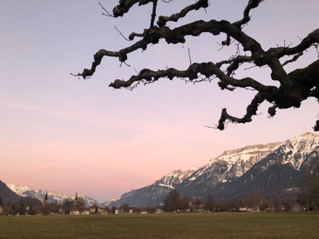 Interlaken, Switzerland, February 11, 2023 View over a green park square in the city center in the evening
