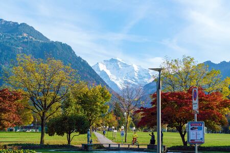 Interlaken, Switzerland - October 17, 2017: Cyclist in the city park against the backdrop of the Jungfrau mountain in the Alps