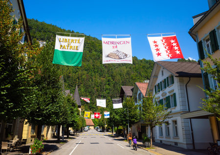 Meiringen, Switzerland - August 22, 2023 - A summer view of an empty street in Meiringen, the birthplace of the meringue dessert