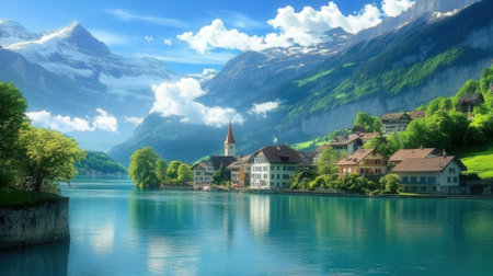 A picturesque Swiss village with stunning mountains and serene lake view