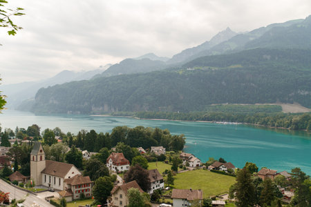 View of Lake Walen, Switzerland, Swiss Alps, Canton St. Gallen, Chatzenberg, summer 2025. Trees, meadows and small villages in the valley. mountains, beautiful landscape hiking, recreation.