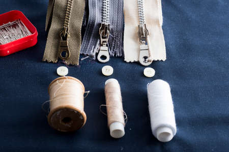 Pack lot of colorful plastic and metal zippers stripes with sliders pattern for handmade sewing tailoring on the blue denim background close up selective focus