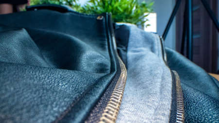 A closeup shot of the black leather jacket with a zipper
