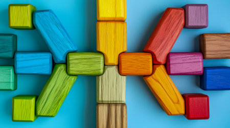 Eye-catching arrangement of vivid wooden shapes forming a mirrored pattern, set against a bold blue canvas, evoking playfulness and harmony.