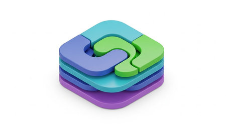 A 3D rendered abstract object composed of interlocking colorful shapes in blue, green, purple, and turquoise, stacked and isolated on white.