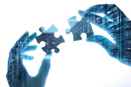 Hands of two people connecting jigsaw puzzle pieces in New York City
