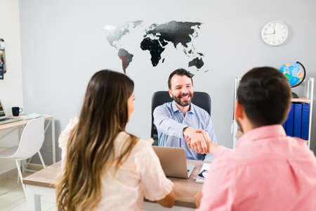 You got a deal. Happy young couple visiting a travel agent to plan their future honeymoon on a tropical cruise