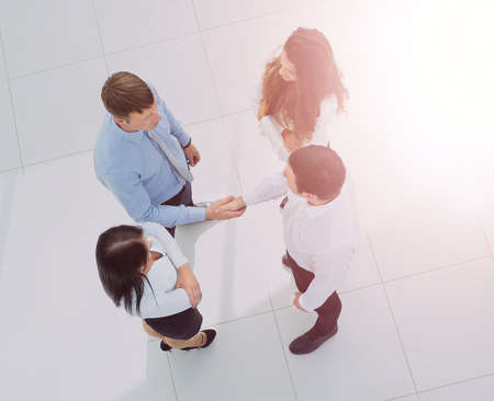 Positive confident business partners ending meeting with handshake, in office and discussing collaboration. High angle. Communication or partnership concept