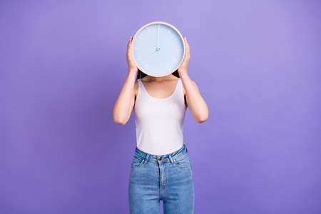 Portrait of charming girl hide her head with round clock watch show deadline time wear good look clothes isolated over violet color background