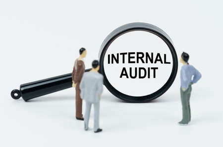 Economy and business concept. On a white background there are figures of businessmen and a magnifying glass, inside of which there is an inscription - INTERNAL AUDIT