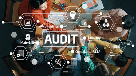 A diverse business team engages in a detailed audit analysis meeting with checklists and documentation in a modern office setting, showcasing teamwork and professionalism. Amity