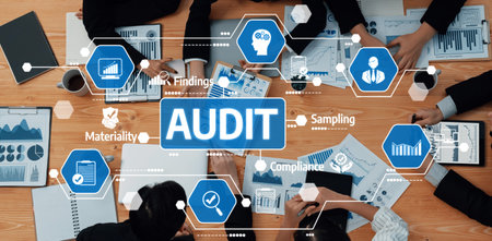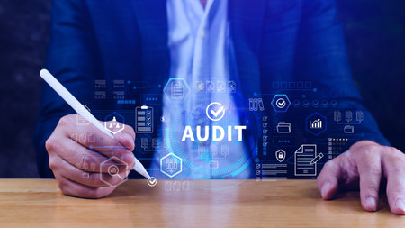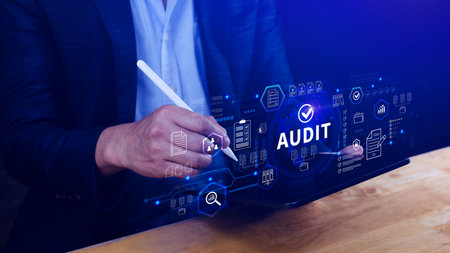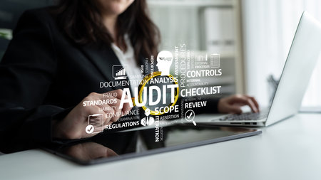 A business professional engages in audit analysis, utilizing digital elements that highlight essential concepts like compliance and documentation in a modern workspace setting. Tessel