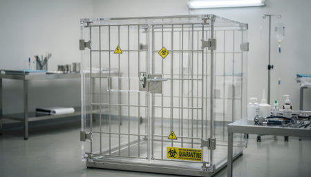 Close medium shot of a quarantine area in a zoo veterinary room with a focused animal enclosure and exam tools softly blurred in the background.