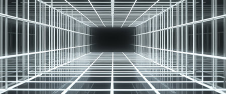 Illuminated tunnel mesmerizing abstract geometric grid of neon rays lights running through middle