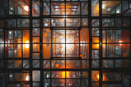 Interior of a modern office building with glass windows and glowing lights