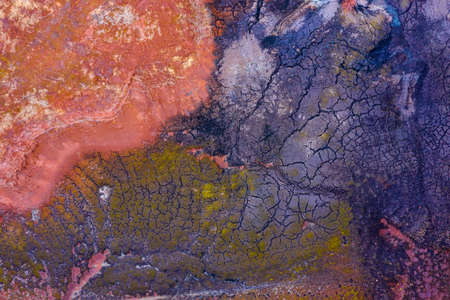 Aerial drone view of industrial chemicals dump site, dry multicolored soil, unique texture.
