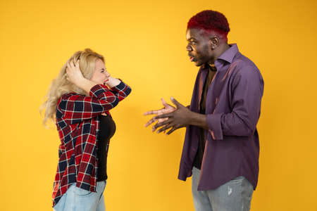 Couple argument. Relationship crisis. Family problem. Cheating disappointment. Multiethnic people conflict Afro man Caucasian woman quarrel yelling isolated on yellow background.